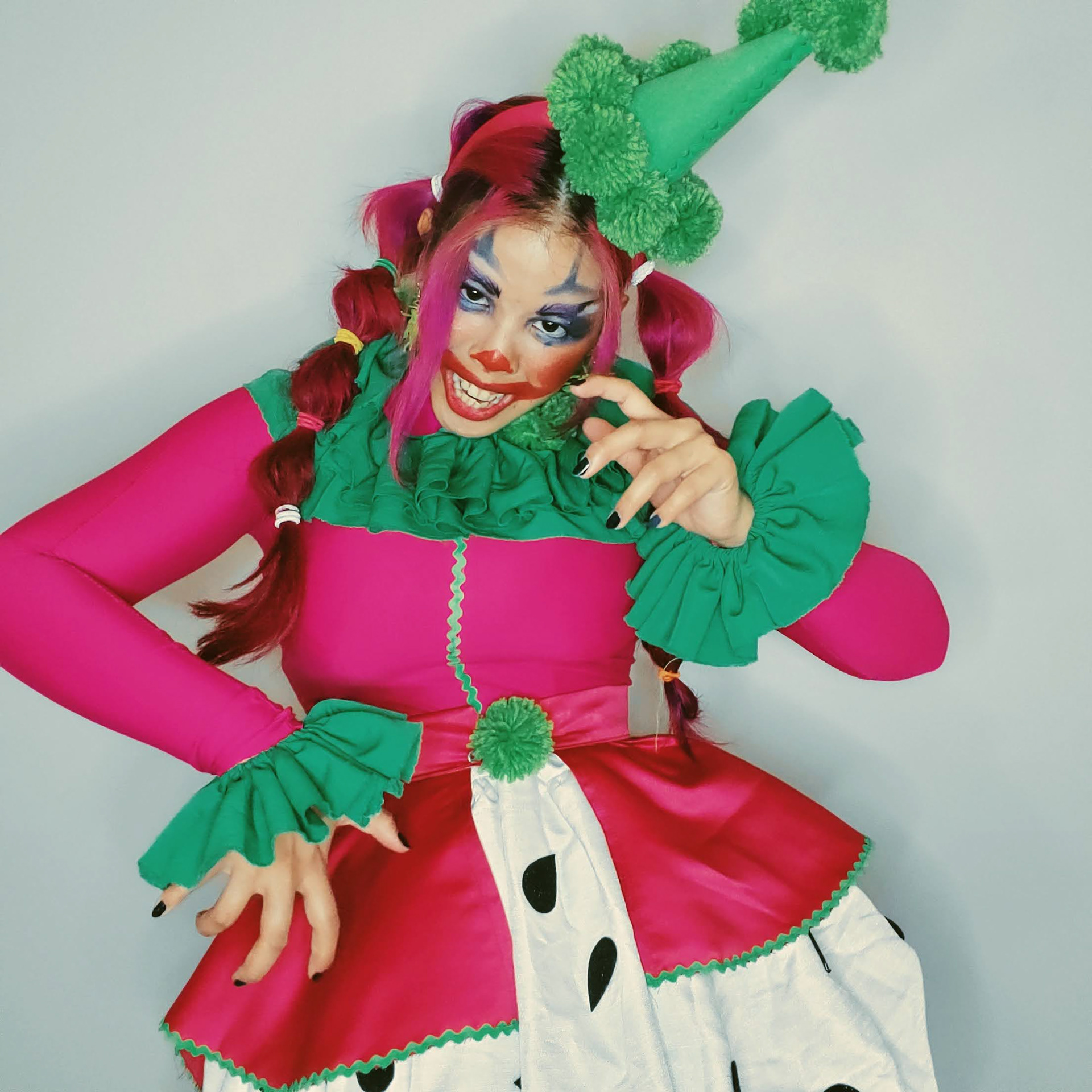 Pieces made of recycled lycra and polyester. Felt covered hat and handmade pompoms.